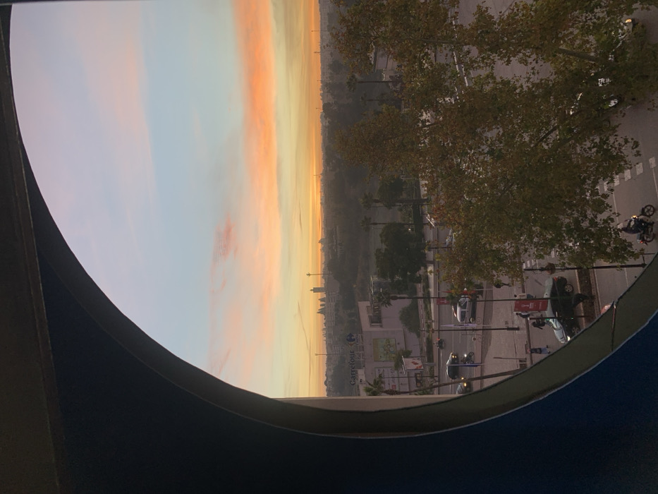 A view from a circular window frames a cityscape under a colorful sky transitioning from light blue to orange. Below, a blend of residential and commercial buildings is visible, including a Carrefour store. Palm trees dot the landscape. A road runs alongside, with vehicles and trees on either side. The sky suggests either sunrise or sunset.