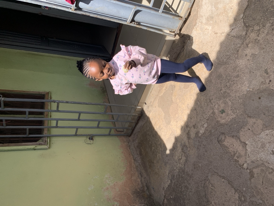A young child is depicted standing outdoors in what is identified as Jos, Nigeria. The child, with dark skin and braided hair, is positioned slightly right of center, looking downwards at a small, light-colored object held in their right hand. They are wearing a light pink long-sleeved top with ruffled shoulders and a faint pattern, paired with dark blue full-length leggings/tights that cover their feet. Behind the child and extending to the left, a building wall painted a faded pale green exhibits signs of wear, discoloration, and reddish-brown staining at its base. A grey metallic window grill with a rectangular grid pattern is fixed into this wall. To the child's right, a partially open grey metallic door or gate frame, featuring a similar rectangular grid design, reveals a dark interior space. The ground beneath the child is a rough, uneven concrete or paved surface, displaying variations in texture and color due to direct sunlight casting prominent shadows, including from the child and the door frame. A small green plant is visible on the ground toward the bottom center of the image.