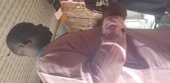 An adult male, dark-skinned with a shaved head, is shown from the chest up, in profile facing right. He wears a light pink long-sleeved shirt with a left pocket and a dark button on the right cuff, and a light blue beaded necklace. His head is slightly angled downward. Partially visible on the far right is the torso of a second individual wearing a dark, graphic t-shirt. The scene is an interior of a commercial establishment, likely a bathroom fixture showroom, in Unknown, Unknown. The background features a patterned white ceiling and a light brown wall, possibly wood paneling, with multiple wall-mounted gold-toned shower fixtures. Two decorative square perforated panels, one light pink and one orange-brown, are positioned above the fixtures. A white toilet fixture is partially visible at the bottom right of the frame.