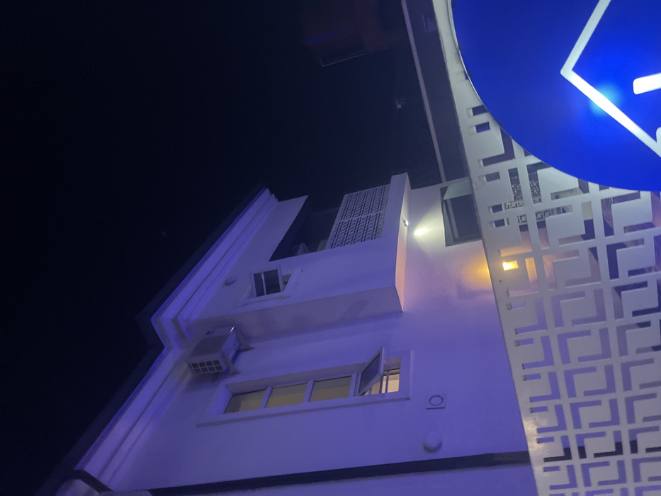 The image displays the exterior of a multi-story building at night in Iranla, Nigeria. The structure features a light-colored, possibly white or cream, facade illuminated by cool-toned artificial lighting, imparting a distinct purplish-white cast to the walls. Visible elements include multiple windows, some closed and others open, revealing internal illumination. An exterior air conditioning unit is mounted between two upper-story windows. A balcony with a white, geometrically patterned balustrade is present on an upper floor. Recessed spotlights cast light onto the building, with one source near the ground floor emitting a warm yellow-orange glow. A numerical '10' and a crescent symbol are affixed to the lower section of the exterior wall. In the immediate foreground, a white decorative fence with a repeating square-and-rectangle pattern partially obstructs the view of the building's base. To the far right, a large, circular, glowing blue sign with a white house-like or arrow symbol is partially visible. The sky is dark, indicating a nocturnal setting. No individuals or specific actions are depicted.