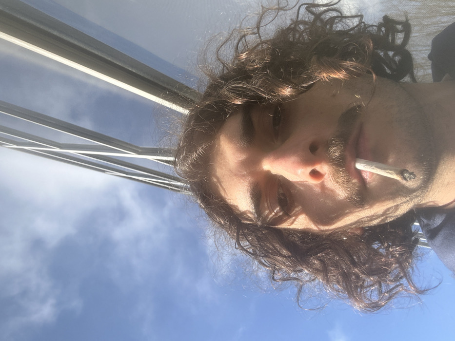 The image captures an adult male in Chatou, France, presented from a low-angle perspective outdoors under a bright blue sky with sparse white clouds. The subject has long, curly dark brown hair and a prominent mustache with light facial hair. He is wearing a dark garment. A lit, hand-rolled cigarette with a glowing cherry and ash is held between his lips. To the right, a building featuring large reflective glass panels and metallic framing is visible, reflecting the sky and clouds. Direct sunlight illuminates the scene, casting shadows across the subject's face.