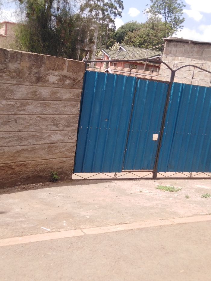 The image depicts a property boundary in Sigona ward, Kenya. In the foreground, an unpaved light brown ground surface transitions to a darker paved road separated by a low curb. A closed, two-panel gate made of blue corrugated metal with a black steel frame occupies the central and right portions of the frame. The gate features exposed rivet fasteners and a small light-colored square patch near the center-right. Barbed wire or razor wire is affixed along the top of the gate's frame. To the left of the gate, a section of a light-colored concrete block wall with horizontal tooling is visible. A small green plant grows at the base of this wall. In the mid-ground, behind the gate and wall, a residential building with a red-tiled roof and light-colored walls is partially visible, surrounded by dense green foliage and tall trees. A concrete structure is also visible behind the right portion of the gate. The sky above is light blue with scattered white clouds. No individuals or discernible actions are present in the scene.