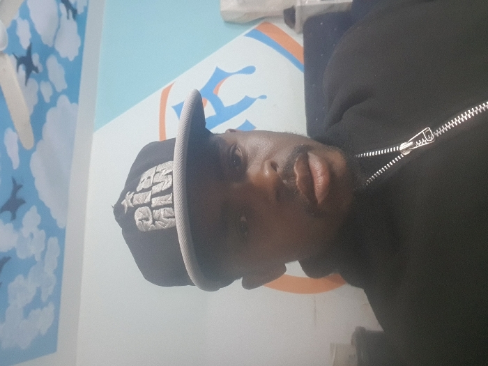 A man in a black hooded jacket and a black cap with white embroidery lies sideways. The jacket's zipper is visible. He has a mustache and a beard. Behind him, the wall is painted with blue sky, clouds, and airplanes, as well as a logo with an orange outline. The man's face is turned toward the camera.