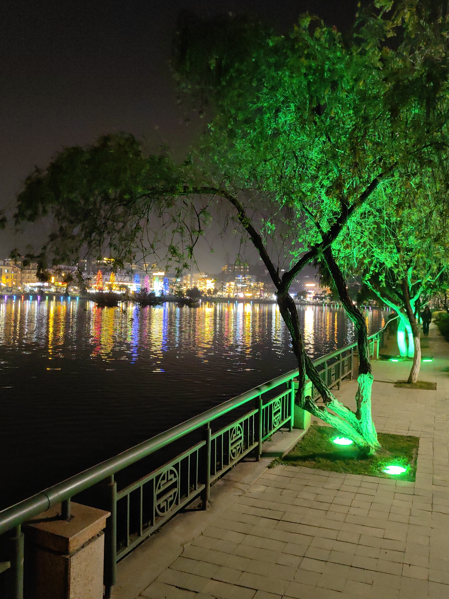 An evening view captures Sa Pa Lake (Hồ Sa Pa) in Sa Pa, Vietnam. The scene is illuminated by artificial light sources. In the foreground, a paved pedestrian walkway, constructed from light-colored rectangular pavers, extends along the right side of the image. A dark green metal railing, featuring decorative circular motifs resembling "shou" symbols, separates the walkway from the water body to the left. The railing is supported by rectangular stone or concrete pillars. Along the walkway, a series of trees are prominently illuminated by green ground spotlights positioned at their bases. Their foliage and trunks glow a vibrant green. Further down the path on the right, a solitary human figure, indistinct due to distance and low light, is walking away from the viewer. The midground is dominated by the dark, reflective surface of Sa Pa Lake, which appears calm. The water vividly mirrors the colorful lights from the opposite shore, creating elongated, shimmering streaks of red, yellow, blue, and white. The background reveals the opposite bank of the lake, featuring a densely built urban landscape. Numerous multi-story buildings are brightly illuminated, casting their varied lights across the water. Several structures on the far bank are adorned with what appear to be large, brightly lit decorative elements, possibly resembling trees or conical structures, displaying multiple colors like red, yellow, and blue. The sky above is dark and overcast.