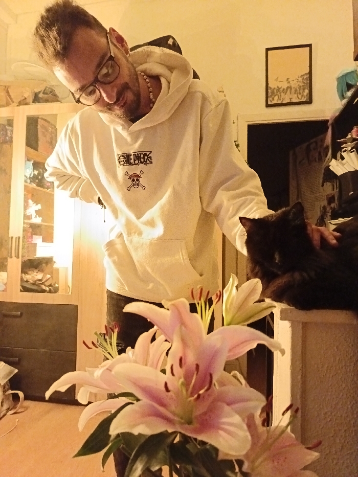 An adult male, approximately 30-40 years old, with short dark hair, a beard, and eyeglasses, is depicted in an indoor setting. He wears a cream-colored hooded sweatshirt displaying a "One Piece" logo (skull and crossbones with text) on the chest, and a multi-bead necklace. His gaze is directed downward and to his left, exhibiting a slight smile. His left hand rests on the back of a black, long-haired cat, which is positioned on a light-colored elevated surface to the man's right. The cat appears to be resting. His right hand is placed on his lower back. In the immediate foreground, out of sharp focus, is a bouquet of pink and white oriental lilies, showcasing prominent stamens and pistils. The background features a light-toned wall. To the left, a wooden cabinet with multiple glass-fronted sections and opaque drawers is visible, containing various indistinct items. To the right of the man, a dark rectangular doorway is present, above which hangs a framed picture depicting numerous dark silhouettes against a light background. Additional shelving with items is partially visible on the far right. The lighting is warm and artificial. The scene is an interior; while specified as being in Toulouse, France, the precise location within the city cannot be determined from the visual information provided.