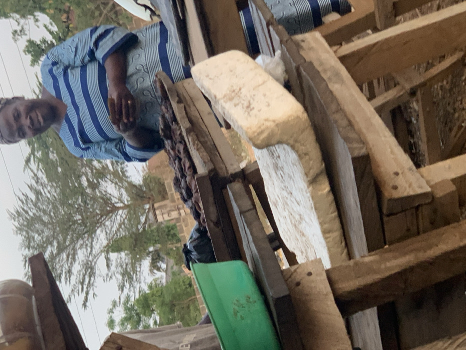 An outdoor shot features a person wearing a blue striped shirt, smiling. In front, stacked wooden materials and a green plastic container are visible. A possible building and trees fill the background, suggesting a daytime setting. The image quality appears slightly grainy.