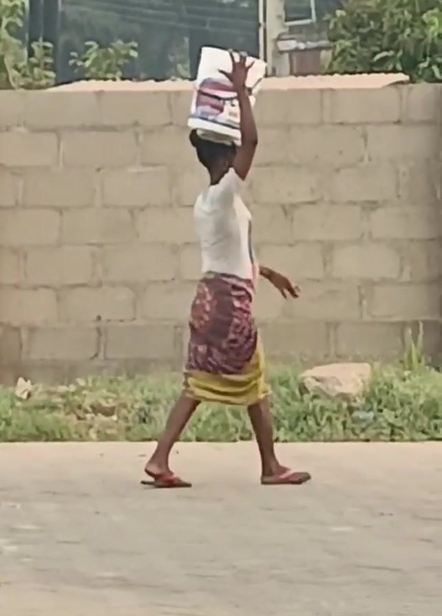 A woman is walking along a paved road while carrying a white bucket on her head. She is wearing a white t-shirt, a patterned wrap skirt, and flip-flops. She is walking away from the camera. Behind her is a brick wall and some greenery, including what appears to be a palm tree. There is also a water tank visible in the background. The lighting suggests it is daytime.