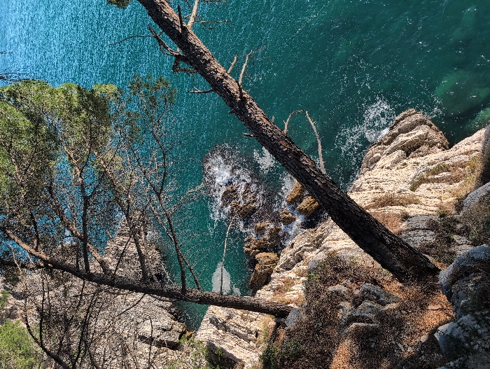 This image depicts a rocky coastal scene in Mirište, Montenegro, viewed from an elevated perspective. A steep, light-colored rock cliff descends into clear, turquoise-green seawater. Two evergreen trees are prominently positioned; one stands upright near the cliff's edge, while a second, larger tree trunk extends diagonally downwards from the cliff, partially overhanging the water. Sparse, dry brown vegetation is visible on the cliff's upper surfaces and within crevices. Jagged rock formations constitute the cliff face and extend into the water below, where waves generate white foam upon impact with exposed rocks. The water's surface is calm with visible ripples and reflections. No human figures or man-made structures are present.