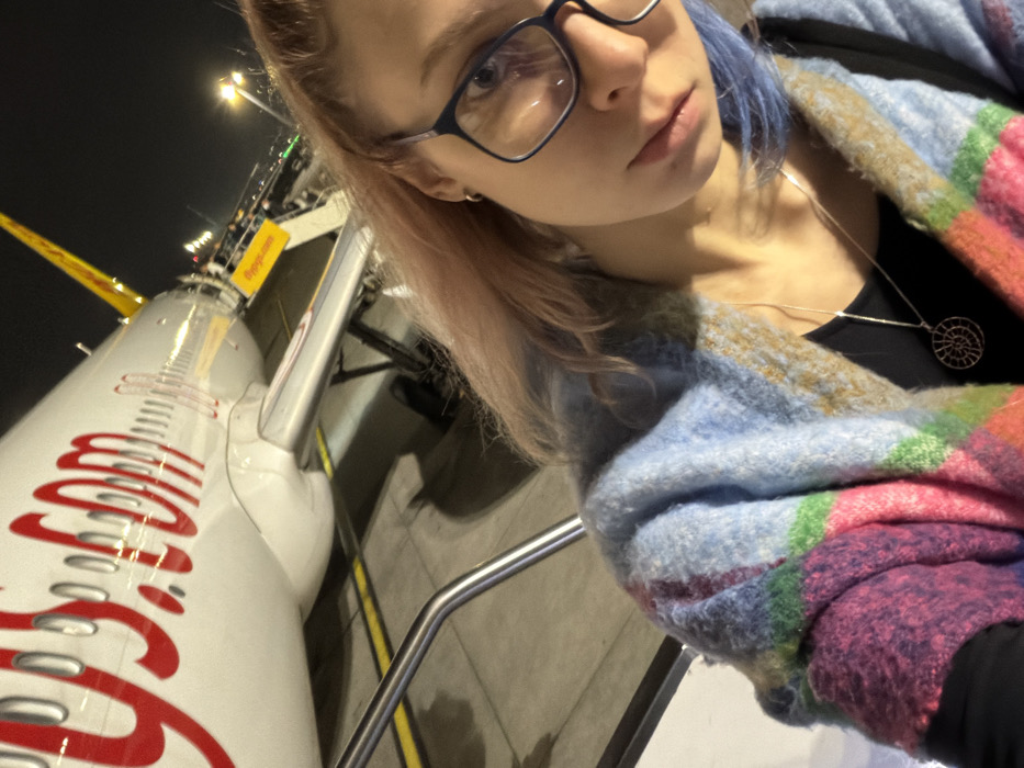 A woman wearing glasses and a colorful plaid sweater stands next to an airplane at night. She is holding the camera at an angle to take a selfie. The plane's logo is visible in red and white. A metal railing and stairs suggest she is about to board or disembark the plane. The lighting is dim, with street lights visible in the background. She wears a necklace with a shell pendant. Some of her hair is dyed light blue.