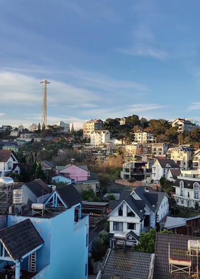 cityscape under a clear blue sky with light clouds. In the foreground, there are densely packed houses with tiled roofs, painted in various colors like blue, brown, and white. In the background, a taller hill features larger, more prominent buildings and houses, seemingly more spaced out and located at a higher elevation. A tall, metal communication tower is visible on the horizon, standing out against the sky. The setting suggests a residential area, possibly a town or a city built on a hilly landscape. There are no visible people or activities.