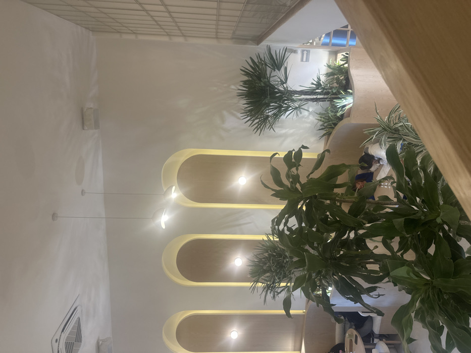 This image depicts the interior of a commercial establishment, likely a cafe or restaurant, located in Puebla City, Mexico. The environment is characterized by a modern aesthetic with light-colored walls, abundant indoor greenery, and warm illumination. The ceiling is white and features a visible air conditioning vent on the left and a square ceiling-mounted speaker on the right. Two white, bell-shaped pendant lights hang from the ceiling in the mid-ground. The back wall is adorned with three evenly spaced, vertical arched niches, each illuminated internally by a single circular light fixture and outlined with a warm yellow glow against a light brown inner surface. To the far right, a wall constructed from square glass blocks or a similar translucent material extends upwards. A light-toned wooden handrail is visible in the lower foreground, indicating a stairwell or balcony. The space is segmented by curved, low-rise planter beds or booth dividers made of a light brown material. Numerous indoor plants are distributed throughout, including large, broad-leafed specimens in the foreground and mid-ground that partially obscure the view. A distinct fan palm-like plant stands within a planter bed on the mid-right. Four individuals are partially visible seated within the booths. Two individuals are situated in a booth on the far left, largely obscured by foreground foliage. Two additional individuals are visible in a booth on the mid-right; one wears a dark blue top and appears to be leaning forward, while the other wears a white garment and is also in a leaning or resting posture. Their faces are not discernible. Small, round tables are present near the seating areas on the left, with drinking glasses visible on one. A small white sign with a right-pointing arrow is affixed to the wall on the far right, beneath the glass block section. Individuals are observed in a seated, relaxed state.