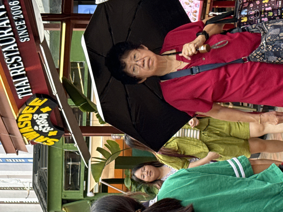 An older Asian woman in a red shirt stands under a black umbrella. She has glasses and a blue purse strap across her chest. Behind her are other people; one wears a green outfit, another a green sweater. To the left is a Thai restaurant sign. The scene appears to be outdoors, with trees and buildings in the background.