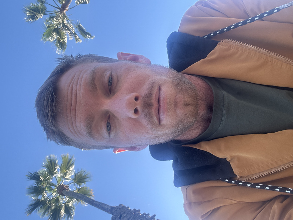 A man with short, light hair and light stubble takes a low-angle selfie against a clear blue sky. Palm trees are visible in the corners of the image. He is wearing a green t-shirt and a tan jacket with a dark hood. A black and white rope detail is visible on the jacket. The man's face is the primary focus, with his gaze directed toward the camera.