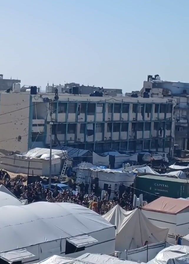 large refugee camp. There are many white tents, some shipping containers, and a crowd of people gathered in an open area. Behind the camp is a damaged multi-story building with broken windows. Some people are visible on the roof of the building. The sky is clear.