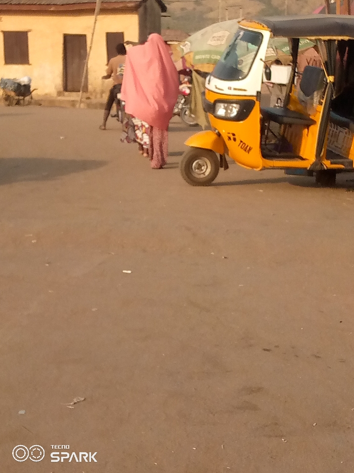 A street scene shows a yellow and white three-wheeled taxi on the right. A person completely covered in a pink cloth walks towards it. Behind them, a man is on a motorcycle. In the background, there's a simple building with two doors and a window, and other indistinct figures. The ground is a dusty brown, and the overall light suggests either early morning or late afternoon. A blurred logo for "TECNO SPARK" is visible in the lower left corner.
