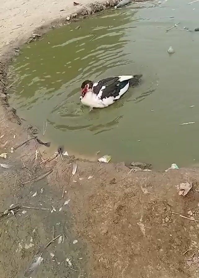 black and white duck swimming and cleaning itself in a small, shallow body of green-colored water. The pool of water is surrounded by dirt and sand, with some loose feathers and trash visible along the edges. In the background, a bird is standing near the edge of the sandy area.