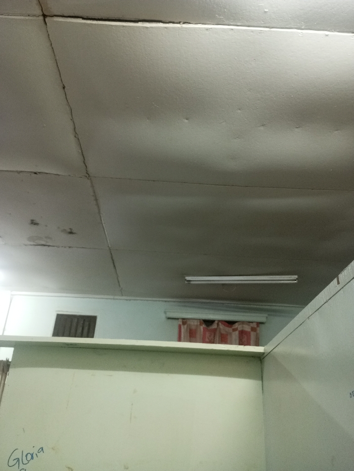 The room's ceiling is white, showing some cracks and imperfections. Below, a partial view of light blue walls with a small, barred window and red patterned curtains is visible. A fluorescent light fixture is also present. Predominantly in the foreground, a pale green structure, possibly a cabinet, with handwriting ("Gloria") is seen. The overall lighting is slightly uneven.