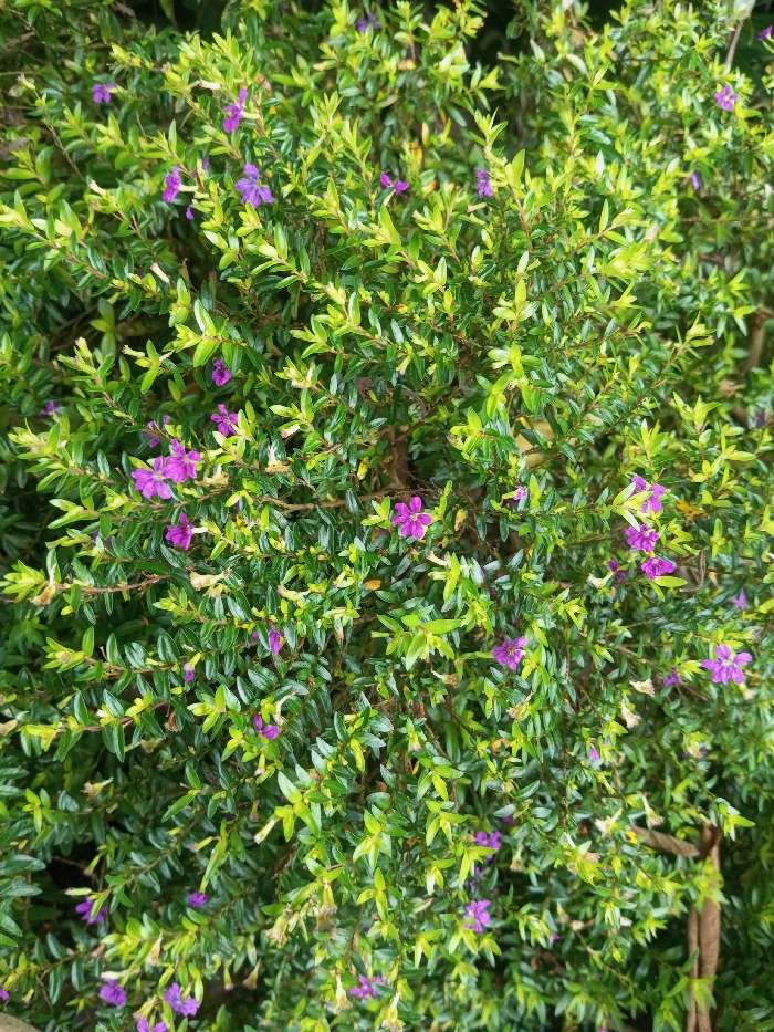 The image displays a dense flowering shrub, located in Tecuci, Romania. The subject is characterized by numerous small, ovate green leaves. Distributed across the foliage are multiple small, five-petaled flowers, uniformly violet in color. No human figures, animals, or artificial objects are present. No actions or interactions are depicted. The environment is entirely botanical, with the shrub filling the frame.