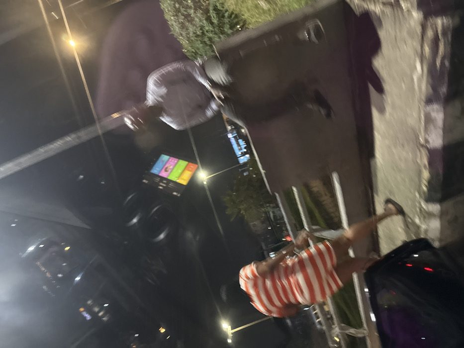 Two individuals stand near a vehicle. One, in a striped red and white outfit, appears to be near the car's trunk. The other, wearing a light-colored shirt, is closer to the front, next to some foliage. The scene is captured at night, illuminated by street lights. A colorful display screen is visible inside the car, adding a modern element to the setting. The image shows a dynamic urban environment.