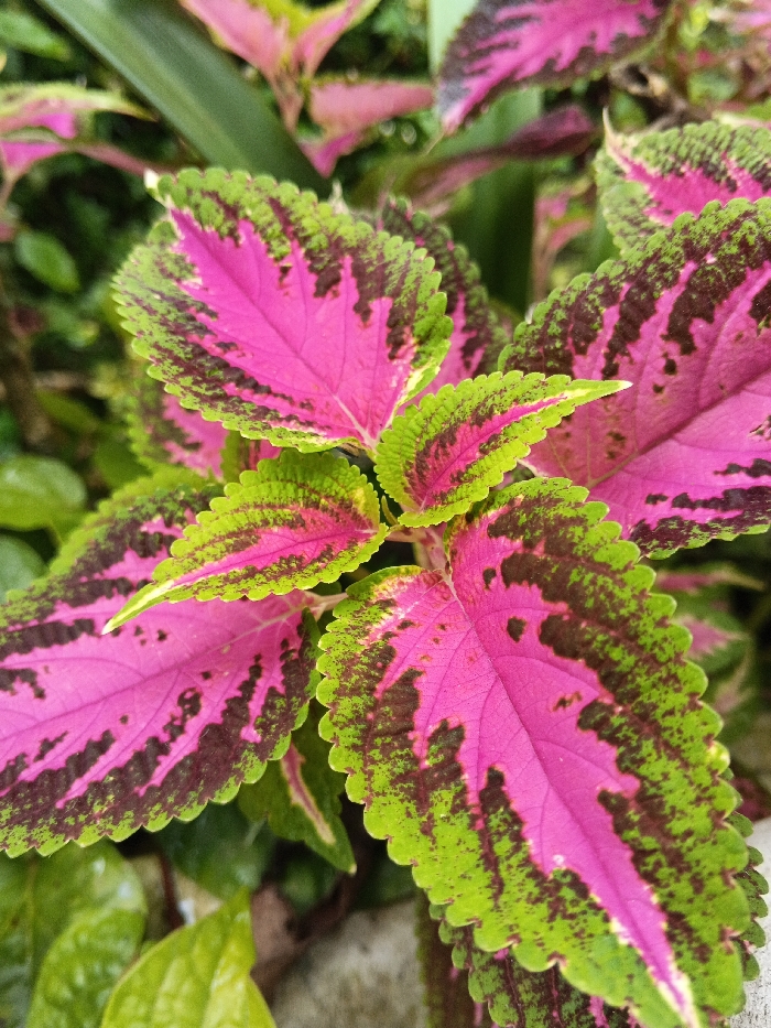 - "A vibrant close-up showcases coleus plants with pink leaves, intricately patterned with dark brown and edged in bright green" by FM-WQ84z2, licensed under CC BY 4.0