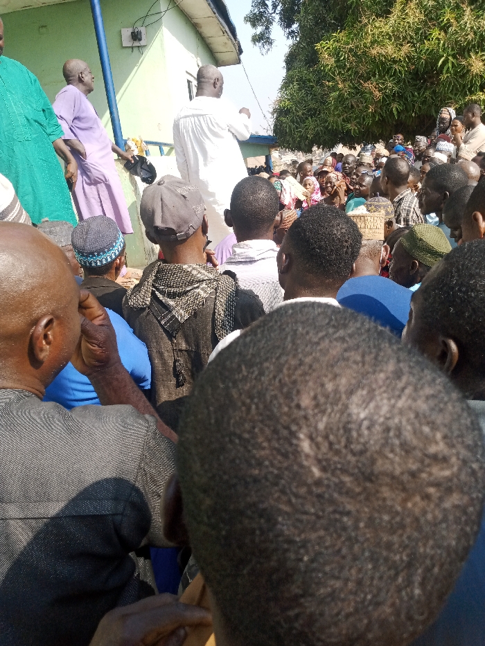 A crowd of people is gathered outdoors. Predominantly, the backs of heads are visible, suggesting the perspective is from within the throng. A man in white stands slightly elevated, possibly addressing the group. Buildings and trees are in the background, with a mix of colors suggesting both foliage and structures. The general impression is a gathering of people listening to a speaker in an outdoor setting.