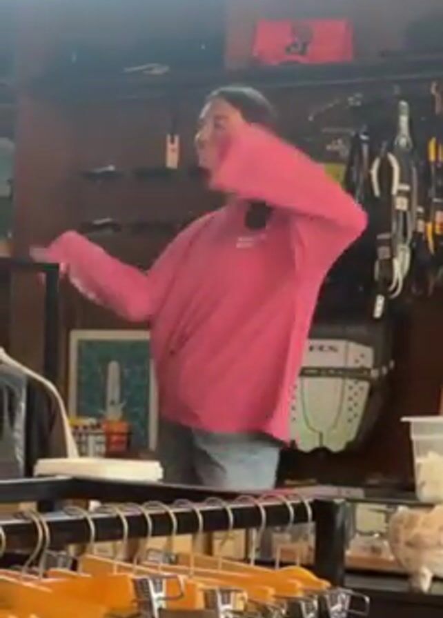 In an indoor setting, a young woman with dark hair pulled back into a low ponytail is dancing. She wears a pink long-sleeved shirt and jeans. The environment seems to be a retail store, as racks of clothes on hangers are visible in the foreground. Behind the woman is a display of items on shelves including sunglasses, harnesses, and various accessories. A bright window provides natural light, contributing to the overall illumination of the scene. The woman appears to be enjoying herself as she moves her arms and dances to the music.