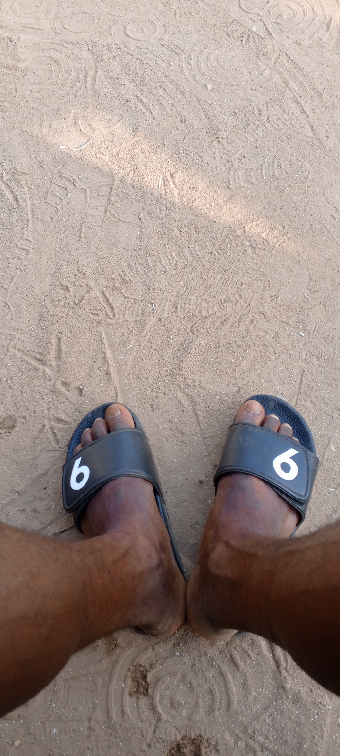 A pair of dark-skinned feet, shod in black sandals with a white "6" on the straps, rests on a sandy ground