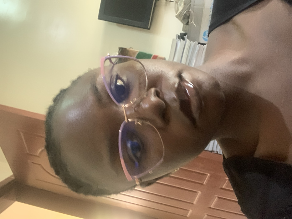 The image presents a close-up, slightly high-angle portrait of a dark-skinned female, likely a young adult, in an indoor setting within Gombe, Nigeria. She has short, dark hair pulled back and is wearing a black top. Her face is oriented directly towards the camera with a neutral expression. She wears cat-eye eyeglasses with pink and light purple upper rims transitioning to gold lower frames. Her lips are covered with a reflective, glossy substance. The background to her left features a light brown, paneled wooden door. To her right, against a light-colored wall, a small, dark-colored television or monitor is visible. Below and to the right of the monitor, a vertical stack of white papers or books is present, accompanied by a partially visible cardboard box, which appears to be branded "HP." A colorful fabric item, partially visible behind the stack, displays sections of green and red.