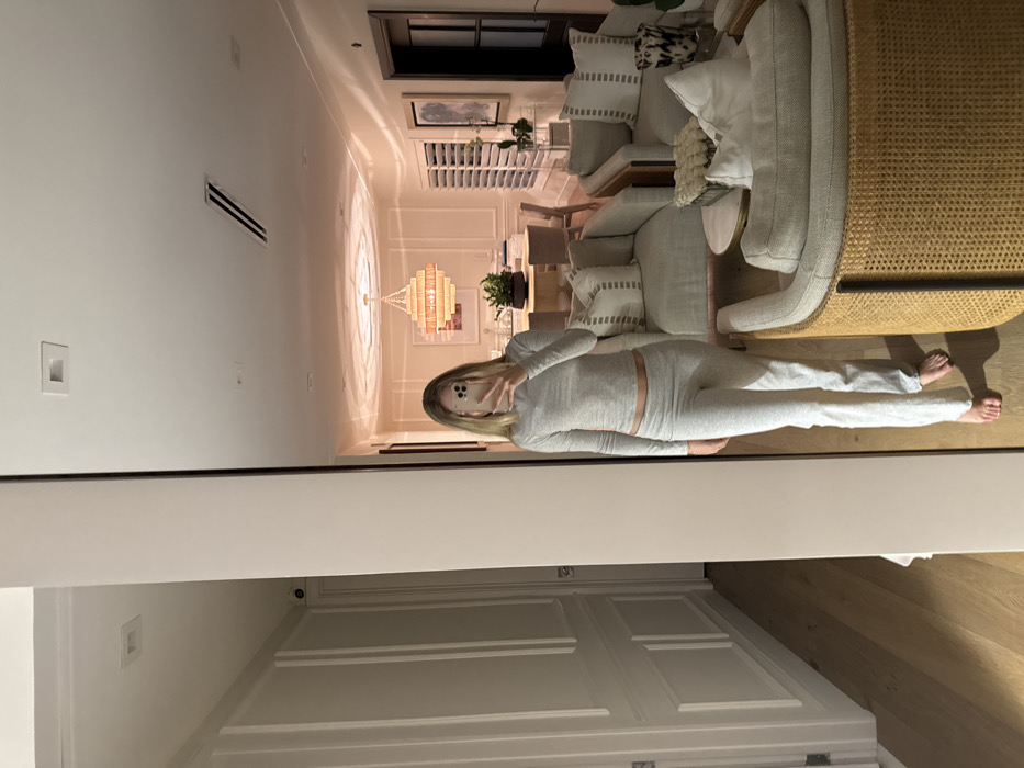 An interior image captures a young female taking a selfie in a full-length mirror within a luxurious residence located in Coral Gables, United States of America. The subject is a Caucasian female, observed from the chest down, with long blonde hair. She wears a light grey two-piece loungewear set consisting of a long-sleeved crop top and matching flared pants, and is barefoot. She holds a light-colored smartphone in front of her upper face, obscuring facial features. The immediate environment to the left of the mirror includes a white paneled wall with wainscoting, a closed white door with a round knob, light wood flooring, and a small dark circular camera or sensor mounted high on the wall. The mirror reflects a lavishly furnished living and dining space. This reflected area displays two light-toned upholstered armchairs with striped throw pillows, a wicker-accented chair, and a white round side table with a decorative object. A large round dining table with multiple chairs and a substantial, multi-tiered chandelier are visible in the background. The room's decor includes additional artwork, recessed ceiling lights, an air conditioning vent, white louvered window shutters, and extensive architectural molding on the walls and ceiling.