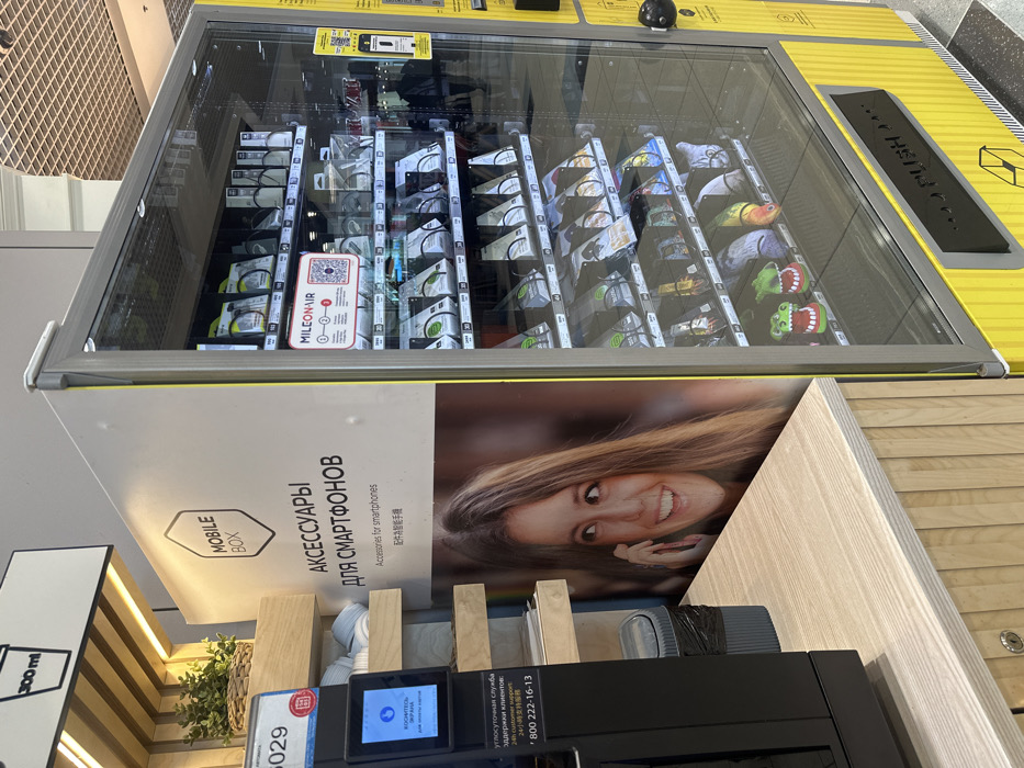 The scene depicts a commercial vending area located indoors in Domodedovo, Russia