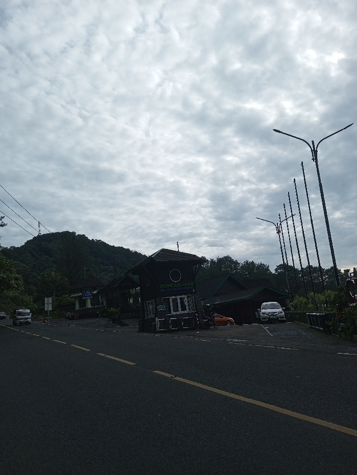 A landscape photograph shows a road leading to buildings and parked vehicles under a cloudy sky. The structure in the foreground appears to be an entrance gate or toll booth with dark wood construction. Streetlights line the right side of the road, and a lush, green hill rises in the background. The road surface is black asphalt with yellow lines, and the overall mood is overcast.