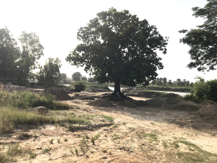 The image displays an outdoor, semi-rural scene in Rido, Nigeria, under a bright, hazy sky. The foreground and midground are characterized by disturbed reddish-brown earth and sand, featuring numerous irregular mounds and piles of excavated soil. Sparse green grass and low-lying weeds grow in scattered patches across the uneven ground, which includes discernible dirt paths or tracks. A large, mature tree with a dense, dark green canopy stands centrally in the midground, its base surrounded by earth mounds and partially exposed roots. To the left of this tree, several smaller, less dense trees are visible. In the background, a calm body of water, appearing brownish-green, extends horizontally across the frame. Beyond the water, a line of trees with varying heights and densities forms the distant horizon. No individuals or direct human actions are depicted; however, the widespread earth disturbance indicates recent or ongoing human activity.