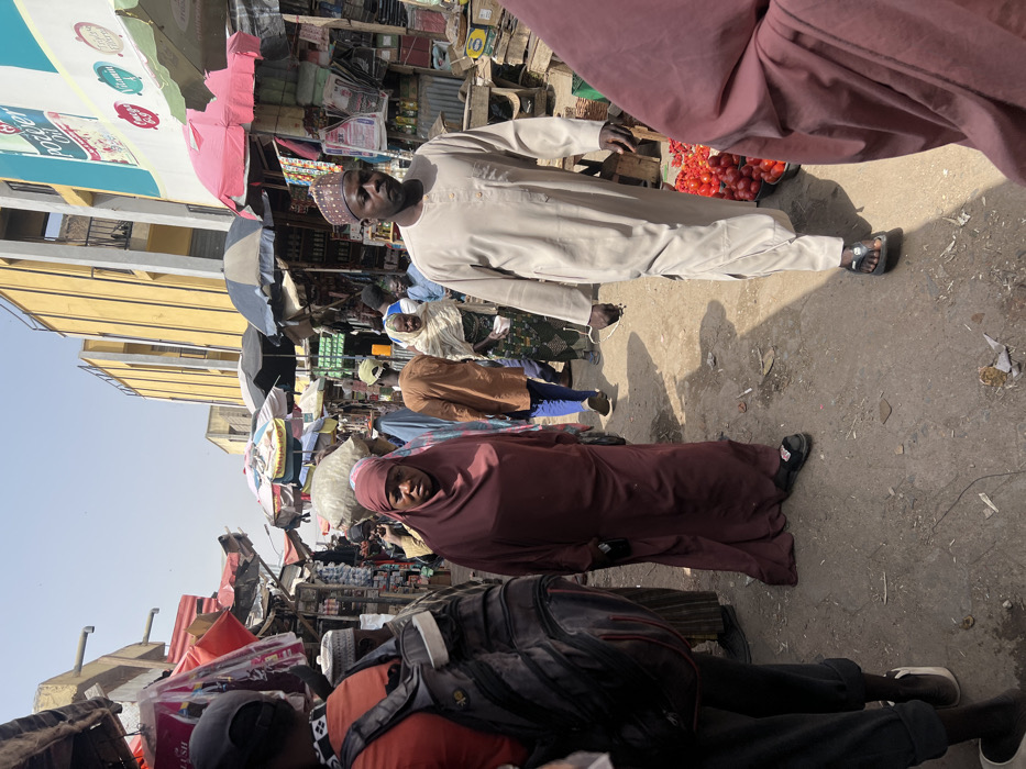 The image displays a bustling outdoor market street in Fagge C, Nigeria, under clear daylight
