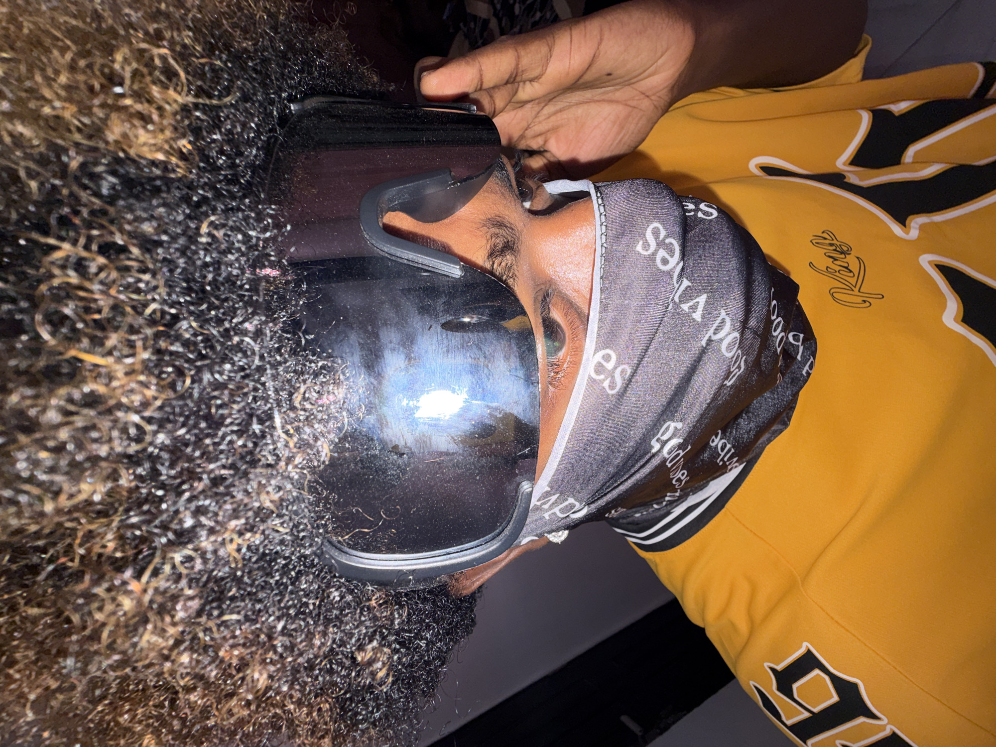 person wearing a VR headset and a patterned bandana partially covering their face. They are wearing a yellow shirt with black and white accents. The person has curly hair with some golden highlights. One of their hands is visible, positioned near the VR headset. No information about the location in Igboefon, Nigeria, is discernible from the image.