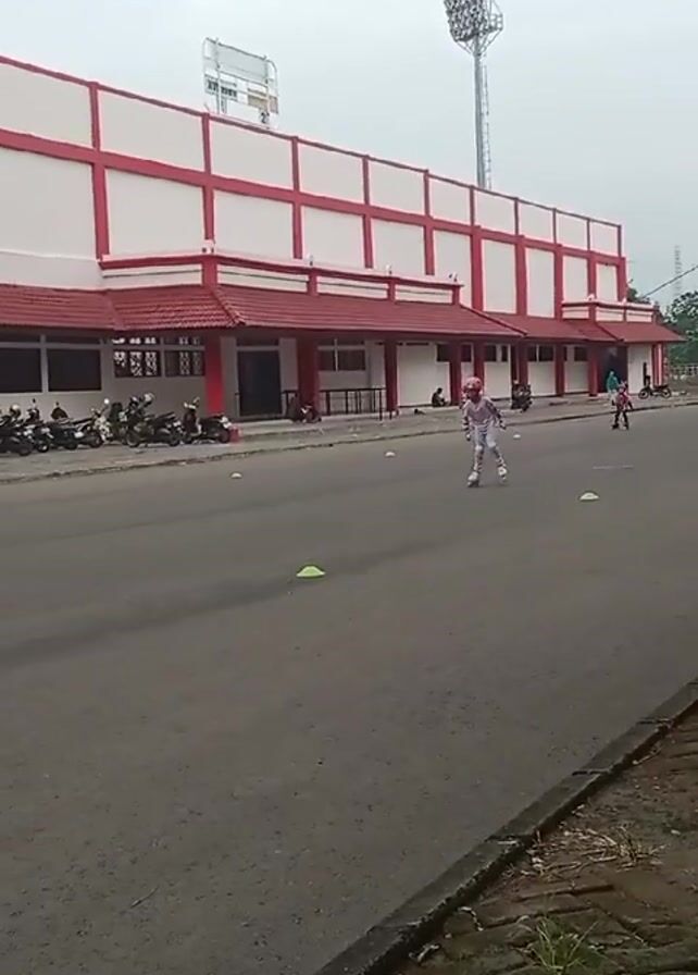 A young person on roller skates is practicing in front of a white building with red trim. The person wears a helmet and light-colored clothing, skating between yellow cones placed on the asphalt. A row of parked motorbikes is visible along the building's side. A tall light tower rises in the background against an overcast sky. The scene is captured from a ground-level perspective, showing a strip of grassy vegetation along the bottom edge of the frame.