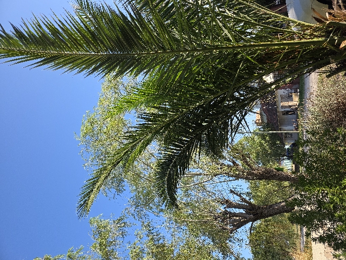 A large, green palm frond dominates the upper portion of the image against a vibrant blue sky. Below, mixed greenery includes deciduous trees with light green foliage. A glimpse of a building with a red-tiled roof is visible behind the trees. The scene gives a sense of a sunny, outdoor environment with diverse vegetation.