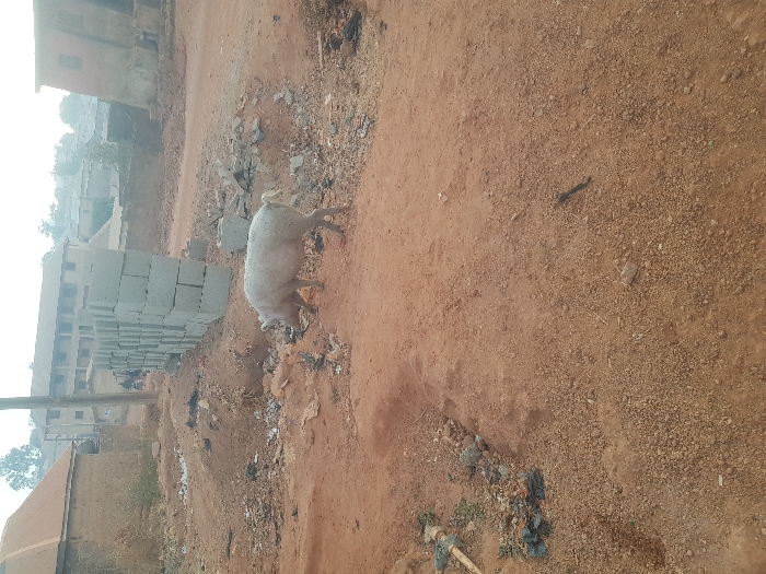 A pig roams a dirt-covered construction site. Stacks of concrete blocks line the edge of the area, with unfinished buildings in the background. The ground is reddish-brown, littered with debris and scattered rocks. A simple hand tool lies discarded near the bottom edge of the scene, implying ongoing work. The photograph captures a rural or developing area where domestic animals coexist with construction activities.