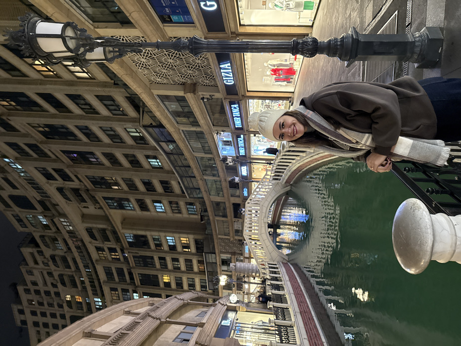 This nighttime image depicts an urban environment in Esenler, Turkey, specifically a themed shopping and residential complex designed with Venetian architectural influences. The scene is dominated by a central female subject and features a canal, a bridge, and multi-story buildings. The foreground is occupied by a female individual, approximately 20-30 years old, positioned slightly to the right of the frame's center. She is smiling and looking directly at the camera. She wears a white knit beanie, a grey and white plaid scarf, a dark brown hooded sweatshirt, and dark blue pants. Her hands are clasped over a black metal railing with a white stone post, which separates her from a narrow, artificial canal. The canal, filled with still, greenish-blue water, occupies the midground. The water reflects the overhead artificial lights and the illuminated shopfronts. A prominent white, stone-arched bridge with balustrades spans the canal in the middle-left of the image. On the right side, an ornate black street lamp with two globes stands vertically, partially obscuring a shopfront. The background consists of tall, curved, multi-story buildings that line both sides of the canal. These structures feature numerous windows, many of which are illuminated, indicating occupancy. The ground floor of these buildings hosts various retail stores with brightly lit window displays and visible signage, including "GIZIA," "TAMER TANCA," "celco," and "UNESCOL." Mannequins displaying clothing are visible in several shop windows. Decorative architectural elements, such as textured patterned walls and classical columns, are also present. Several other indistinct figures are visible on walkways and near shop entrances in the background. The sky above is dark, indicating a nighttime setting.