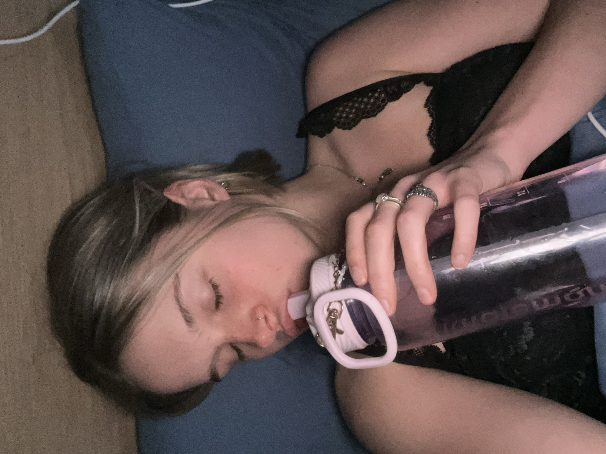 A young woman is lying on her side on a blue surface. She is wearing a black lace top and several rings on her fingers. She is holding a large, clear plastic water bottle with a pink lid to her mouth. Her eyes are closed, and her hair is blonde. The surface she is lying on appears to be a bed or couch. A section of brown flooring is visible on the left side of the frame. The location is not evident from the visual information provided, so it is impossible to determine if it is in Vancouver, Canada.