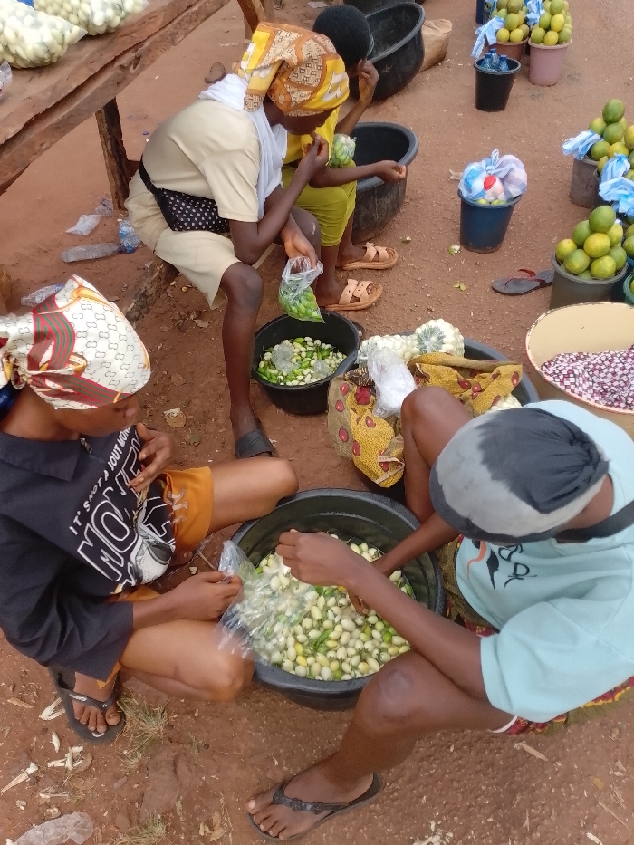 This image captures an outdoor market scene in Ejule, Nigeria, featuring four individuals engaged in selling and packaging produce