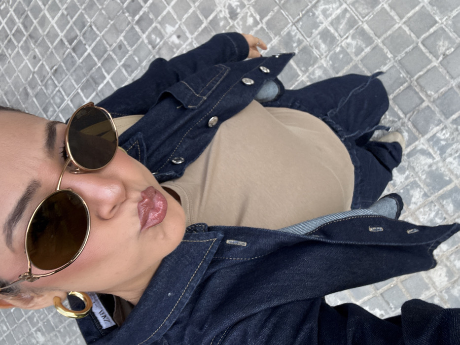 A single individual, a woman, is depicted in a downward-angled selfie, visible from the chest to the upper thighs. She is outdoors in an urban environment. Her face is partially obscured by oval sunglasses with gold frames and dark lenses. Her lips are pursed in a "kissing" gesture, coated with a glossy light pink product, and her cheeks exhibit a pink flush. She wears a dark blue denim jacket, partially unbuttoned, over a plain light beige short-sleeved top. Dark blue denim pants are visible below the jacket. Large, thick gold hoop earrings are present on both ears; the left earring features a faint "ZARA" branding. A light-colored strap, consistent with a backpack or shoulder bag, is visible over her right shoulder. The immediate environment is an urban sidewalk characterized by a light grey square-tiled pavement arranged in a diagonal grid pattern with dark grout lines. No specific landmarks are visible to identify a precise location within the city of València, Spain.