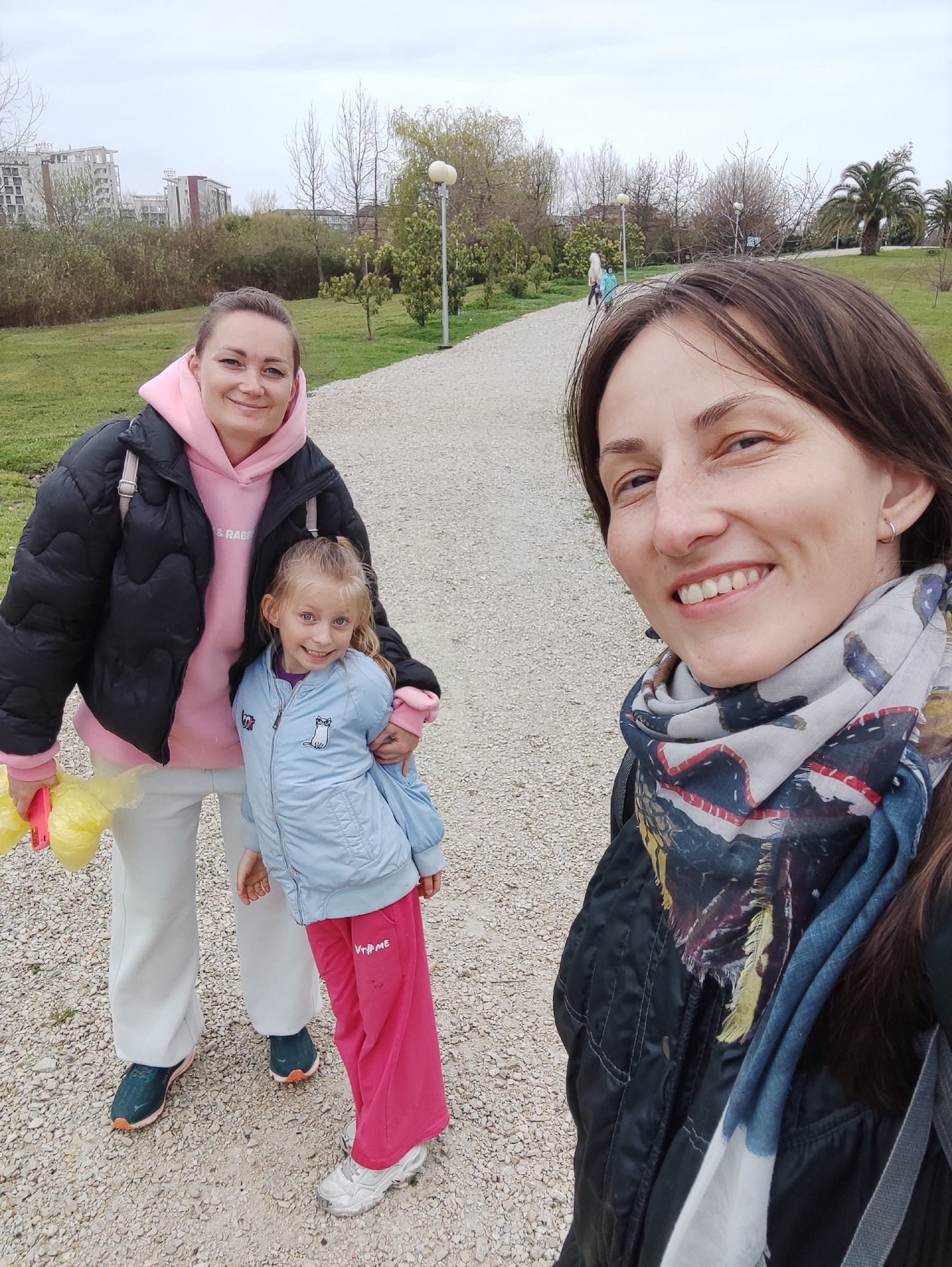 Three individuals are visible in this outdoor setting. A woman with dark hair, wearing a dark jacket and a patterned scarf, appears to be taking a selfie. To her left stands another woman, wearing a black puffer jacket over a pink hoodie and white pants. A young girl stands in front of the second woman, wearing a light blue jacket and pink pants. The background features a gravel path, grass, trees, and buildings. The location is in the city of Sirius, Russia.