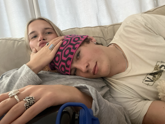 Two individuals, a female and a male, are depicted in an indoor setting on a light-colored upholstered couch in Kingston, Canada. The female, with blonde hair and a nose stud, wears a grey long-sleeved top. Her left hand, adorned with multiple silver rings (including a prominent rectangular blue stone ring and a textured coral-like ring), is visible in the foreground. Her right hand is positioned on the male's head. Her lips are pursed. The male, wearing a light-colored t-shirt with a "VANS" logo, a thin silver chain necklace, and a small left ear stud, is reclined with his head resting on the female's upper torso. He wears a dark pink and black geometric patterned beanie/headband. Both individuals are looking directly towards the camera. A light-toned curtain or blinds are visible in the background. A blue object is partially visible in the lower right foreground.