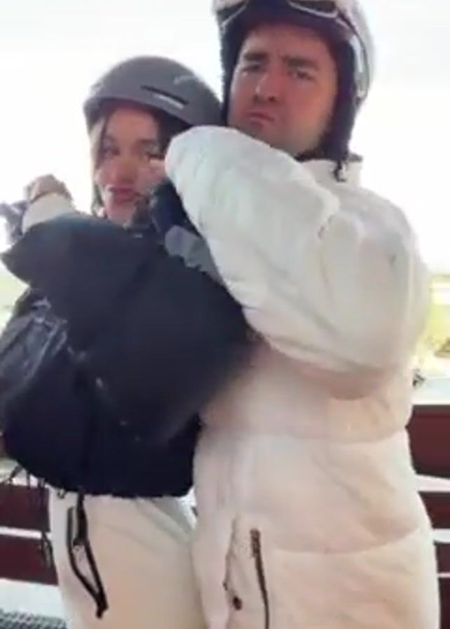 Two people wearing ski helmets and winter clothing are standing together outside. The woman is on the left and has a black ski jacket. The man is on the right wearing a white ski suit and goggles. They both hold up their hands making the "call me" hand gesture. The background shows a snowy outdoor environment.