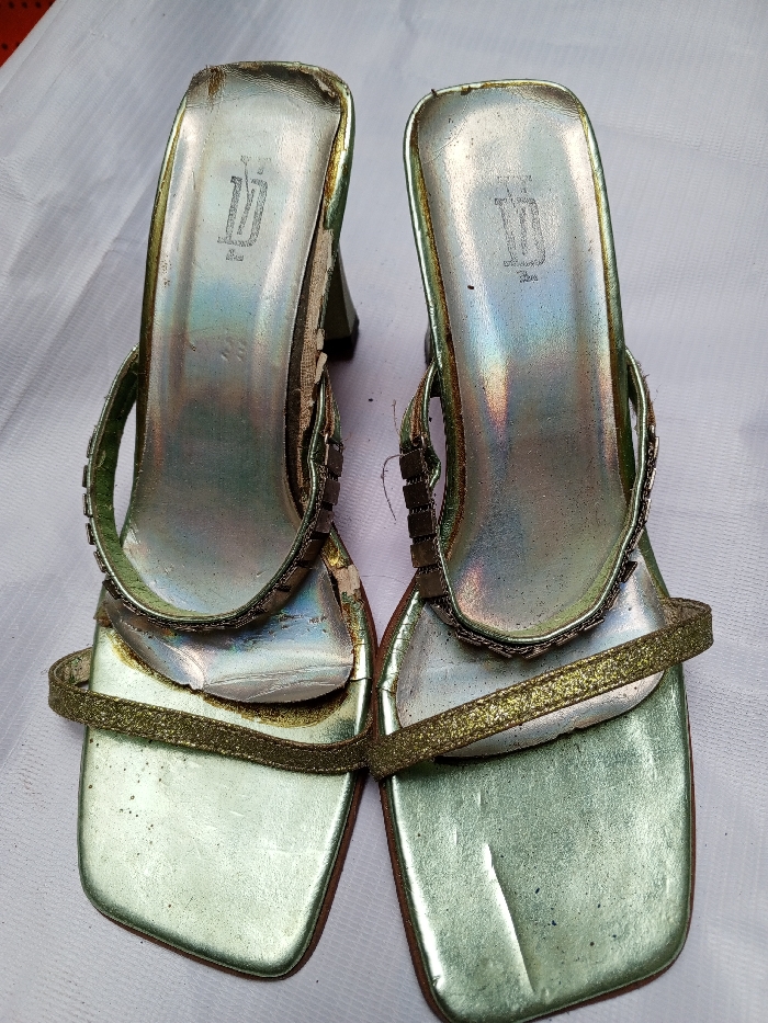 - "Two worn, green and gold high-heeled sandals sit on a white surface" by FM-Z0D4I2, licensed under CC BY 4.0
