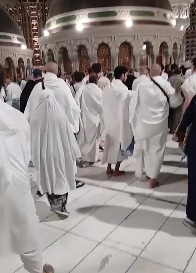 nighttime view of the Great Mosque of Mecca. The scene is crowded with people, many of whom are wearing white robes, suggesting they are pilgrims. Several people wear white caps. The plaza is paved with light-colored tiles. In the background are two domes and modern high-rise buildings. The scene appears to be lively.