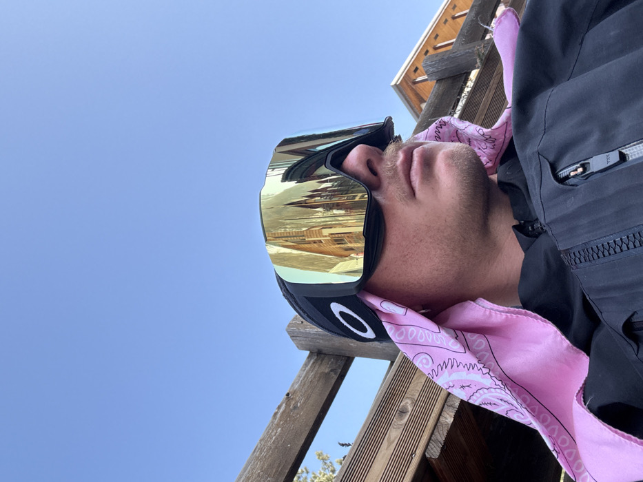 A male individual is depicted from the mid-chest upwards, looking to the right of the frame, under a clear blue sky in Saint-Chaffrey, France. He wears black Oakley brand ski goggles with a wide, reflective gold-mirrored lens over a black beanie. A light pink bandana with a white paisley pattern is positioned beneath the beanie, with ends visible on both sides of his neck/jawline. The individual has a light mustache and stubble, and a silver hoop earring is visible in his left ear. He is wearing a black jacket with a prominent vertical zipper on the chest and a smaller horizontal zippered pocket on the upper left chest. In the background, to the left, a wooden railing structure composed of horizontal planks and vertical posts is visible, with sparse green foliage behind it. To the right, the corner of a building with wooden siding and a sloped roofline can be seen. The reflective goggles prominently display a distorted reflection of a large, multi-story structure with distinct alpine-style architecture, characterized by multiple gabled roofs and visible windows, consistent with buildings found in a mountain resort environment such as Saint-Chaffrey.