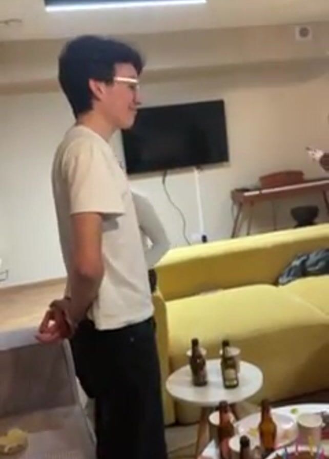 room with several people gathered. A young man in a white t-shirt and black pants is standing and talking, gesticulating with his hands. Another man in a white turtleneck and gray pants is briefly seen dancing or moving energetically, then sits down on a yellow couch and looks at his phone. A woman in a brown sweater is also seen looking at her phone in the background. A coffee table in front of the couch holds several beer bottles and a cake with candles. There is a television on the wall, a piano in the background, and various furniture pieces including a gray couch. The lighting is bright and the atmosphere seems casual and celebratory.