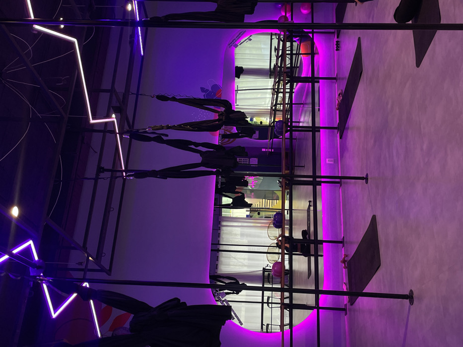 The scene depicts the interior of a fitness studio, illuminated by pervasive purple and magenta LED lighting originating from strips along the base of a mirrored wall and within large, circular cut-outs in the mirrors