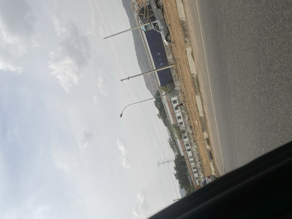 This image depicts a roadside scene in Jiru, Nigeria, viewed from a moving vehicle. The foreground features an asphalt roadway with a dashed white line, bordered by a low concrete curb and a dry, light-brown median strip. In the mid-ground, a long, single-story building with multiple windows and a light-colored facade, partially obscured by a fence, runs parallel to the road. A section of its roof appears reddish-brown. To the right of this building, a large blue shipping container with white Chinese characters on its side is visible. A solitary individual wearing a reddish top and dark trousers walks on the dry median strip between the road and the building. Utility poles with overhead wires and a street light line the median. A silver pickup truck, loaded with light-colored, irregularly shaped debris secured by netting, is either parked or slowly moving on the right side of the image, adjacent to the blue container. The background reveals distant hills and mountains, with scattered green foliage. A large metal power transmission pylon stands against the sky on the far left. The sky itself is partly cloudy with varying shades of white and light grey. The lower-left corner of the image is obscured by the dark frame of a vehicle's window.